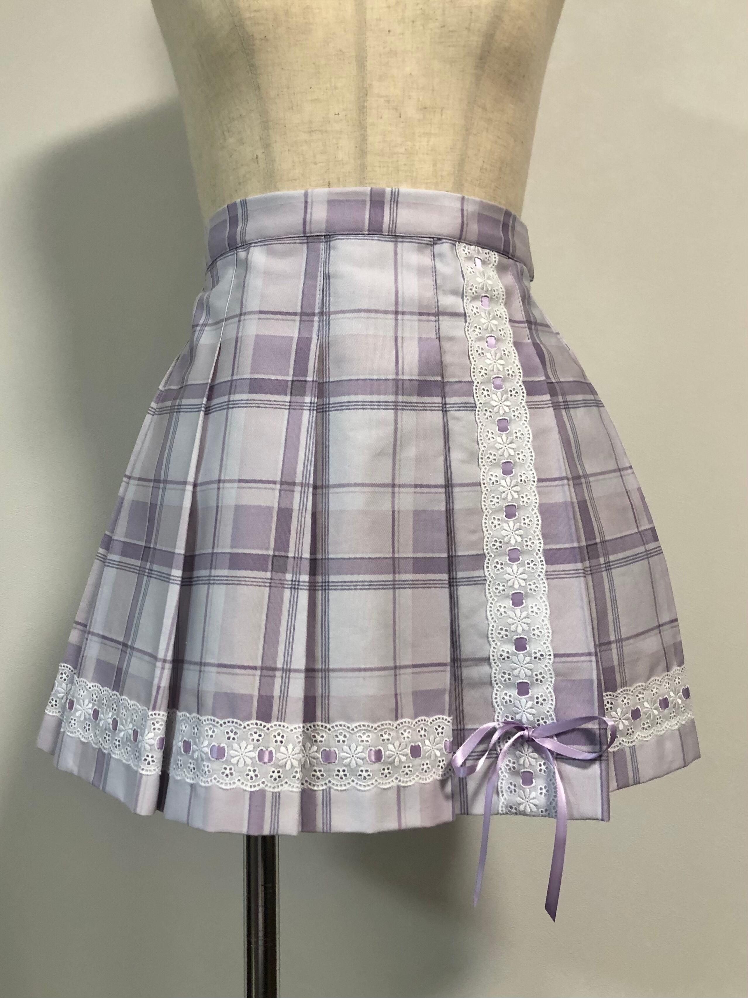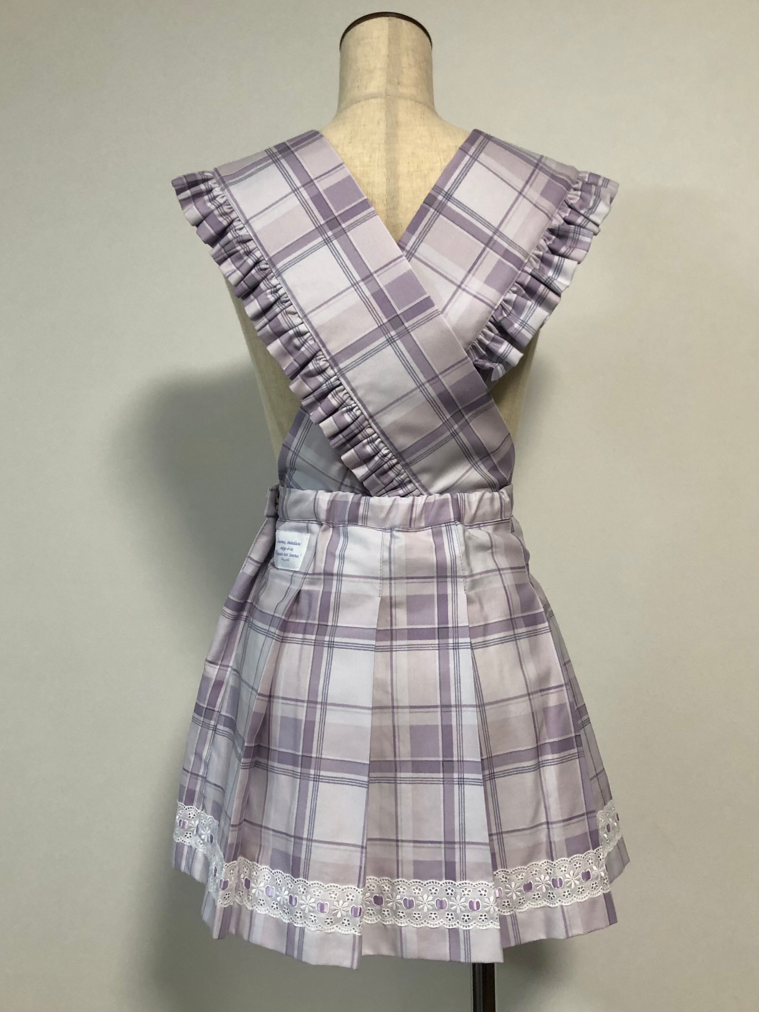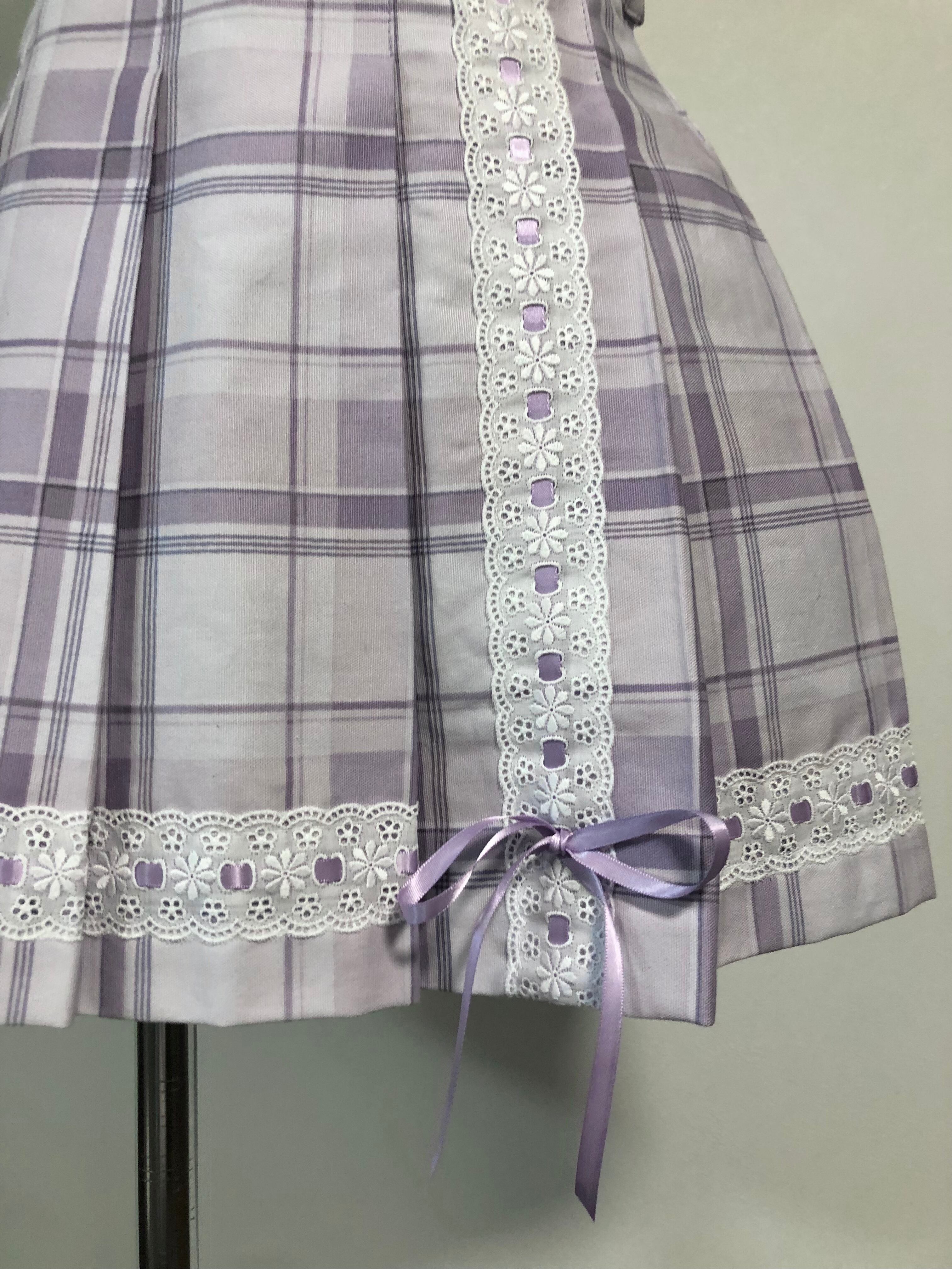 【現品限り】 ハシゴレースを使ったプリーツスカート。 サスペンダー部分は取り外せます。 ウエスト62cm(最大67cm) 総丈38.5cm